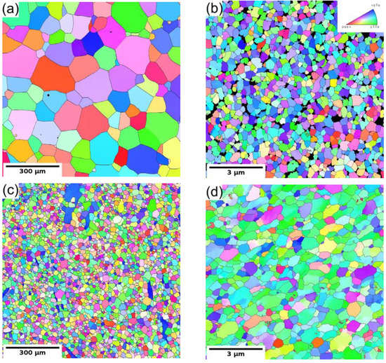 The EBSD/TKD orientation maps of both investigated alloys: (a) WE43-0P, (b) WE43-8P, (c) W3-0P, and (d) W3-8P sample.
