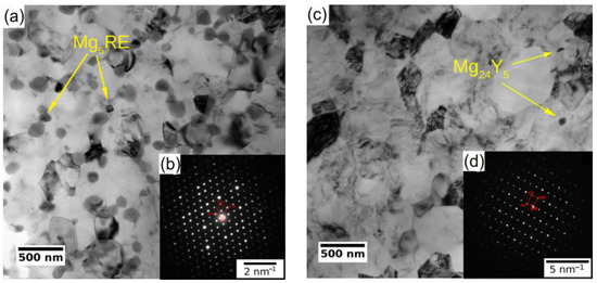 TEM micrographs (bright field) of UFG conditions of (a) WE43-8P and (c) W3-8P. Representative SAED patterns of (b) Mg5RE and (d) Mg24Y5 intermetallic particles.