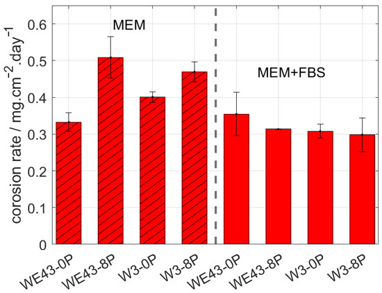 The corrosion rate of the investigated materials after 14 days of immersion in MEM and MEM + 10% FBS biological media.