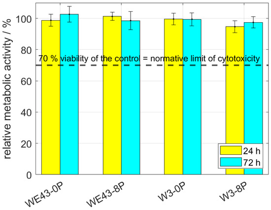The relative metabolic activity after 24 h and 72 h of L929 murine fibroblasts—elution tests. The dashed line stands for the normative limit of 70% metabolic activity of the control. Error bars express the sample standard deviation of two-four samples measured in six iterations.