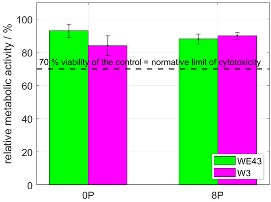 The relative metabolic activity after 24 h of L929 murine fibroblasts—direct tests. The dashed line stands for the normative limit of 70% metabolic activity of the control. Error bars express the sample standard deviation of two-four samples measured in six iterations.