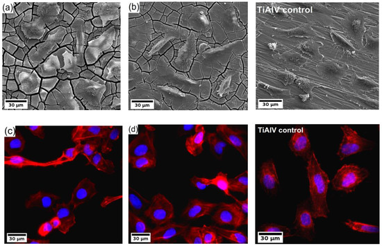 Finally, the U-2 OS human osteosarcoma cells were cultivated directly on the surface of the investigated samples for 24 h, and subsequently, the samples were analyzed by fluorescence microscope and SEM. The resulting micrographs are shown in Figure 6. The investigation showed that the cells colonized all types of samples. The cells were well spread with developed actin fibres. Also, evident amitosis is visible in the micrographs from the fluorescence microscope. Note that only the results of the ultrafine-grained samples of both investigated alloys are shown because the results were qualitatively similar to their coarse-grained counterparts.