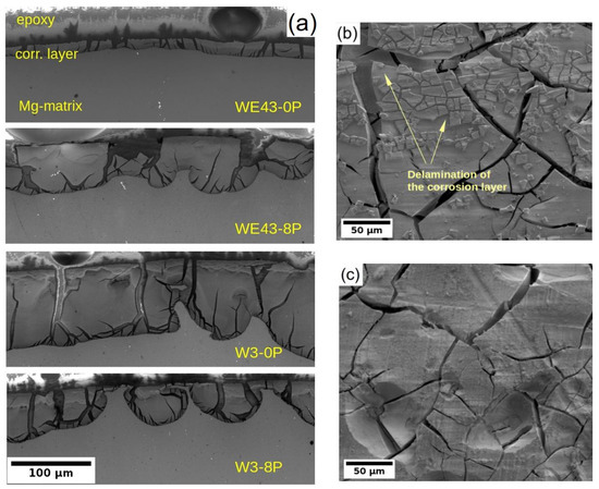 Due to the better understanding of the corrosion performance of studied alloys in MEM biological media after 14 days of immersion, the corrosion layers of all four samples were examined by SEM. Note that the MEM solution was selected for this analysis because differences in the degradation rate were observed between the alloys and the type of samples. In the case of MEM + 10% FBS solution, all samples exhibited a comparable degradation rate. The cross-sectional cut through the developed corrosion layer is shown for all samples in Figure 7a. The darkest area in each figure corresponds to the epoxy resin used for the sample fixation during its preparation for SEM, the dark grey area accounts for the corrosion layer formed on the sample surface, and the light grey zone corresponds to the sample. The figures clearly depict that the corrosion front propagated uniformly in all samples except the W3-8P, where the formation of partially connected pockets was observed. Nevertheless, the corrosion layer thickness in the W3-8P sample was, on average, lower than its coarse-grained counterpart (W3-0P). It is also visible that the corrosion layer consists of profound cracks in all samples. Not surprisingly, the WE43-0P exhibited the thinnest corrosion layer (~20 μm), almost four times lower compared with the rest of the samples. The thin corrosion layer could indicate suppression of the corrosion front propagation, which corresponds to the results of the corrosion resistance and the mass loss tests in Section 3.2 and Section 3.3, respectively. On the contrary, the investigation carried out on the surface of the sample showed that there was significant delamination of the corrosion layer in the WE43-0P sample (see Figure 7b), which was not observed in any other one, cf. Figure 7c, and could distort the measurement of the corrosion layer thickness.