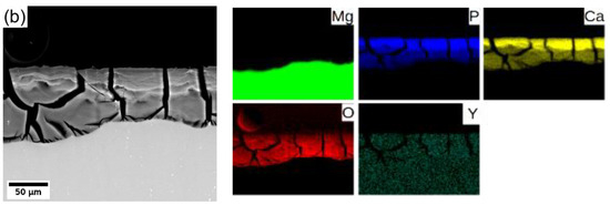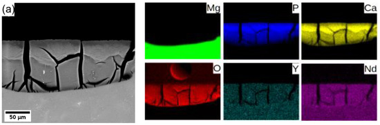 In general, Mg degrades in the aqueous environment and produces a corrosion layer mainly composed of magnesium oxide MgO and/or magnesium hydroxide Mg(OH)2 [3,9,11,29] on the fresh surface. Elemental mapping across the corrosion layer of 8P conditions of both alloys (see Figure 8) showed that yttrium (neodymium) is being uniformly built in the corrosion layer of both alloys. Increased content of calcium and phosphor in the outer part of the surface layer proves the formation of stable amorphous calcium phosphates (CaP) [30,31], which commonly form during the degradation of magnesium alloys in biological media. Generally, the composition of the corrosion products depends directly on that of the immersion media.