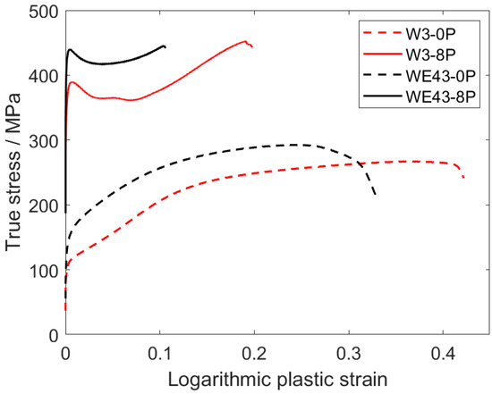 Mechanical properties of all investigated samples were studied by standard compression deformation tests at room temperature and Vickers microhardness tests. The true plastic stress–strain curves are presented in Figure 9. The evaluated values of the compressive yield strength (CYS), ultimate compression strength (UCS), and deformation at maximum stress are presented in Table 3. The comparable values of the CYS and UCS were observed for the initial condition of both alloys regardless of the different grain sizes. After ECAP processing, the CYS increased significantly in both alloys. The CYS value of the WE43-8P was substantially higher than that of the W3-8P alloy, while the UCS values remained comparable. On the other hand, the W3 alloy exhibited significantly (double) higher deformation at maximum stress values in both coarse-grained and ultrafine-grained conditions. ECAP processing also resulted in a significant change in the deformation curve shape. The coarse-grained samples exhibited a typical power-law shape (WE43) and weak S-shape (W3), while a distinct sharp yield point was present in the deformation curve of both ultrafine-grained materials, see Figure 9. In addition, the Vickers microhardness testing (HV0.1) were performed on the cross-section of all the investigated samples, and the average values of the microhardness are included in Table 3. Similar trends to those of the CYS/UCS were also observed in the case of the HV0.1 values, which increased clearly and steadily from 73 ± 5 or 57 ± 3 (WE43-0P or W3-0P, respectively) to 114 ± 3 or 100 ± 3 (WE43-8P or W3-8P, respectively).