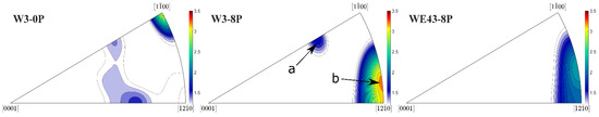 In order to fully explain differences in the deformation behaviour of the investigated samples, XRD texture measurement was performed. The inverse pole figures (IPF) corresponding to the W3-0P, W3-8P, and WE43-8P samples calculated for the extrusion/ECAP processing direction are shown in Figure 10. Note that texture for the WE43-0P sample was not measured because it is a cast condition and is considered to be texture-free. All three samples exhibited weak texture with the typical texture components for the individual processing steps. IPF of the W3-0P sample showed a distinct peak in the corner, which corresponds to the formation of fibre during the extrusion. This fibre usually forms during the extrusion of the magnesium alloys because of the predominant activation of the basal slip system [32]. The less-developed texture element occurring in the middle of the IPF triangle corresponds to grains that have their c-axis tilted from the extrusion direction by ~50°. This texture element usually forms in magnesium alloys containing Y and/or RE [33]. ECAP processing resulted in the formation of two texture components in the W3-8P sample and only one in the WE43-8P sample. It was repeatedly shown that the texture component denoted as “a” is formed by the predominant activation of the basal slip system [33,34,35], and the component denoted as “b” is formed by the predominant activation of the prismatic and <c + a> pyramidal slip system [36,37,38]. It is important to note that the “b” component was stronger in the W3-8P sample, while the “a” component was missing in the WE43-8P sample.