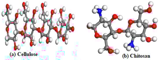 Optimized structures of pure cellulose and pristine chitosan, where red atoms are O, grey atoms are carbon (C), blue atoms are N, and white atoms are H.