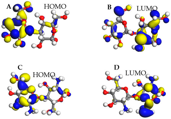 We also studied the frontier molecular orbitals to gain insight into the interaction of pristine cellulose and chitosan with additives such as niobium, titanium, and magnesium. Figure 2 depicts the highest occupied molecular orbital (HOMO) (Figure 2A) and the lowest unoccupied molecular orbital (LUMO) (Figure 2B) for pristine cellulose. The same analysis was performed on pristine chitosan, the highest occupied molecular orbital (HOMO) (Figure 2C) and the lowest unoccupied molecular orbital (LUMO) (Figure 2D) or which are also plotted in Figure 2. Furthermore, the energy band gap was determined according to Equation (2).