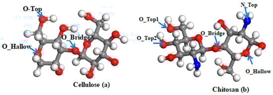 The adsorption sites (O_Top, O_Hallow, O_Bridge, N_Top, O_Top1, and O_Top2) of cellulose and chitosan.