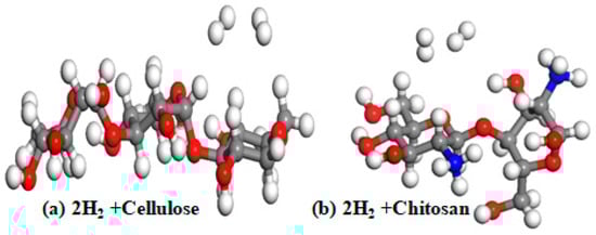 The results presented in Table 2 reveal a weak interaction (physisorption) between hydrogen and cellulose and between H2 and chitosan. The calculated binding energy between H2 and cellulose is 0.095 eV, compared to 0.090 eV for chitosan. These results align with results previously reported in the literature [48]. Furthermore, by increasing the number of H2 molecules in pure cellulose and chitosan to two, a decrease in the binding energy is observed: = 0.083 eV and = 0.050 eV, for cellulose and chitosan, respectively. The optimized structures are displayed in Figure 4.