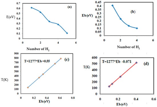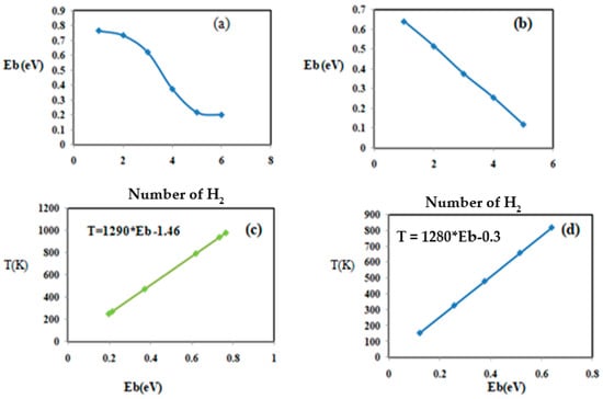 To better, observe the correlation between the adsorption energy and the number of added H2 molecules. The maximum hydrogen storage capacity for niobium-coated chitosan is five hydrogen molecules, as shown in Figure 8, and the addition of the six H2 molecules is not stable. This result indicates that niobium-doped chitosan can store five H2 molecules in the quasi-molecular form before reaching saturation. Figure 8a,c shows the binding energy for the successive H2 additions. The desorption temperature (TD) of successive H2 adsorption varies in the energy interval of 136–786 K. However, in the case of titanium-doped chitosan, the maximum storage capacity is three H2 molecules in the quasi-molecular form, with binding energy in the range of 0.132–0.405 eV. A fourth H2 molecule is in an unstable configuration, with an adsorption energy of 0.099 eV. The corresponding desorption temperature for the successive addition of molecules varies in the range of 168–517 K. To better understand the correlation between the adsorption energy and the corresponding desorption temperature, Figure 8c shows the desorption temperature changes (TD) with respect to the hydrogen binding energy for niobium-doped chitosan. Figure 8d also displays the desorption temperature (TD) for different hydrogen adsorption energy for titanium-doped chitosan. Furthermore, the relation between the desorption temperature (TD) and the binding energy (Eb) is expressed by TD = 1290 × Eb − 1.46 in niobium-doped chitosan and TD = 1280 × Eb − 0.3 in the case of titanium-doped chitosan.