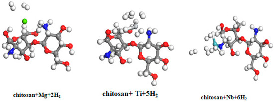 Optimized structure of the interaction of magnesium-, titanium-, and niobium-doped chitosan with the successive addition of hydrogen molecules; red atoms are O, blue atoms are N, grey atoms are carbon (C), green atoms are Mg, grey metallic atoms are Ti, forest green atoms are Nb, and white atoms are H.