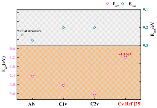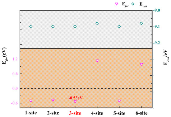 The hydrogen storage capacity of the structure is still reflected in the Efor and Ecoh, as shown in Figure 6. The structures incorporating H still all have negative Ecoh values, indicating that these structures are thermodynamically stable at absolute 0 K.