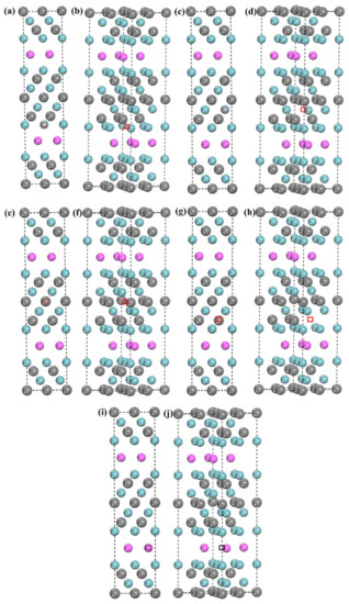 Crystal structure of Nb4AlC3 with vacancies considered in this work (a,b) Nb(1)v; (c,d) Nb(2)v; (e,f) C(1)v; (g,h) C(2)v; (i,j) Al(v).