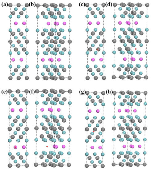 The structures after the relaxation of several different vacancies absorbing H are shown in Figure 5. In the calculation process, we find that H cannot exist stably in the Nb(1) vacancy and move to the site composed of one Al atom and three Nb(1) atoms (the NbC layer below) in the tetrahedron, which means that Nb(1) vacancies cannot be used as storage sites for H. It can be seen from Figure 5g,h that H is also not stable in the Nb(2) vacancy and will combine with the adjacent C(1) atom, which is similar to the case of H in the 6-site, as shown in Table 2. Therefore, H is less likely to be present in some lattice vacancies, probably because these vacancies are much larger than H atoms, so H is somewhat more inclined to be in interstitial sites. Then, as shown in Figure 5e,f, H can stably exist in the Al vacancy with an Efor of −2.41 eV, and the c-axis of the structure can be found to be shortened because the atomic radius of H is much smaller than that of Al. Finally, as shown in Figure 5a–d, H can exist stably in both C(1) vacancies and C(2) vacancies; the Efor are −3.05 eV and −3.68 eV, respectively. And the lattice constants of the a, b, and c axes are shortened. It is worth noting that the relaxed position of H in C(1)v is located in the center of the octahedron consisting of six Nb(2) atoms.