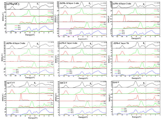 Finally, the DOS of these three doped structures with vacancies all show positive values at the Fermi level, and the Nb-4d state is still dominant, as shown in Figure 7g–i. In the region far from the Fermi level, the peak at −11.3 eV in DOS is contributed by the s-state of C and the d-state of Nb, which indicates that the formation of Nb-C arises from the hybridization between Nb and C. Then, the region from −5 eV to −4 eV is contributed by the d-state of Nb and the p-state of C, which is the typical TM d-C p-bonding relationship of the MAX phase. Then, Figure 5g shows the DOS of H incorporated into the C(1)v structure, and the PDOS of H shows a peak at 6.74 eV above the Fermi surface, contributed by the s-state of H and the d-state of Nb. This shows that when the Nb-H bond is formed in the C(1)v structure, this structure has specific stability. The DOS diagram of the H-doped structure of C(2)v is shown in Figure 5h. The −3–1 eV part below the Fermi surface of the DOS is contributed by the s-state of H and the 4d-state of Nb, which explains that the Nb-H bond formation originates from the hybridization of Nb and H, and the same situation occurs in the Al(v) structure, as shown in Figure 5i.