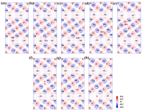 The CDDs where H is incorporated at 1-, 2-, and 3-sites in the Nb-Al layer are shown in Figure 8a–c, and the CDDs where H is incorporated at 4- and 6-site in the Nb-C layer are shown in Figure 8d,e, the vacancy structure is shown in Figure 8f–h. In the 1-, 2-, and 3-sites, there is partial electron transfer between H atoms and surrounding Nb and Al atoms, showing characteristics of ionic bonds. The amount of charge transfer at the 1-site is the highest in the Nb-Al layer. The H and other atoms in the Nb-Al layer only form bonds with ionic character, which is different from our previous case of adding O in the Nb-A layer [31] because the electronegativity of H is much less than that of O. Similar to the case of the Nb-Al layer at the 4-site, charge transfer occurs between the H and the surrounding Nb atoms, showing an ionic bond characteristic. The charge transfer in the 6-site does not appear between H and surrounding Nb atoms but concentrates between H and a neighboring C (2) atom, forming a C-H covalent bond. However, the electronegativity is close, and the electron Clouds are biased toward carbon atoms. As in the previous analysis, the 6-site is a tetrahedron with a larger space than the 4-site, and H may not be able to exist stably in a larger space. Therefore, higher stability will be obtained by combining with C. Then, in the three vacancy-containing structures, a certain amount of charge transfer occurred between H and surrounding Nb atoms, indicating that a bond with an anionic character is formed between H and Nb. It is worth noting that the electron density difference of H in the Al(v) structure hardly changes, which is different from the Al atoms present at this position in the parent phase. This phenomenon is because H atoms have higher Pauli electronegativity than Al atoms and are more likely to obtain electrons. In addition, it can be observed that the charge transfer before Nb and H is significantly less than that between Nb and Al. This shows that the bonding strength between Nb and H is low, which provides evidence for increased cohesive energy after H doping into the Alv structure.