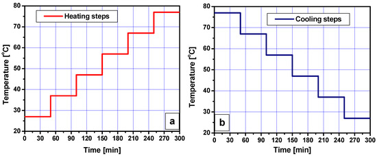 r’ at different temperatures between 27 and 77 °C during the heating and cooling procedures applied to the tested samples.