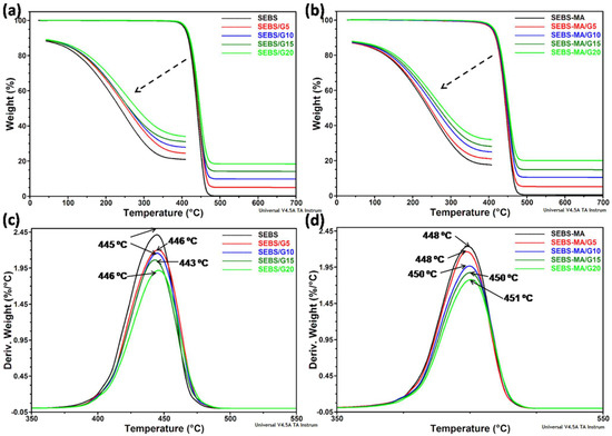 Moreover, the storage modulus variation with temperature is different for SEBS-MA and its composites compared to that for SEBS and its composites. While the storage modulus is quite constant for SEBS and SEBS/G composites up to 70 °C, it continuously decreases with temperature for SEBS-MA and SEBS-MA/G composites, suggesting a lower onset and/or a higher range of the phase transition of styrene blocks for the latter. This decrease in storage modulus at temperatures lower than 70 °C for SEBS-MA and SEBS-MA/G composites is probably due to their lower average molecular weight (Mn) and higher melt flow index (MFI) compared to the ones for SEBS and SEBS/G composites. Indeed, the MFI measured in the same conditions is 5.0 g/10 min for SEBS and 17.2 g/10 min for SEBS-MA, while Mn is 79,100 for SEBS and 58,000 for SEBS-MA, according to the producer data.