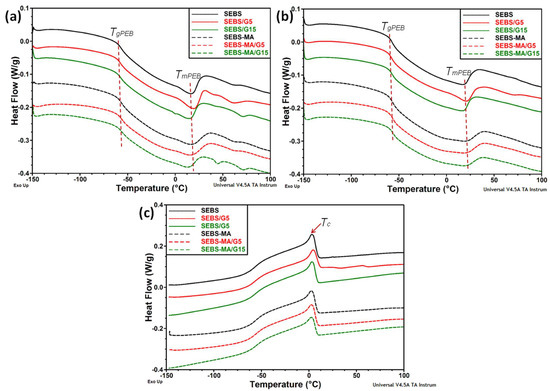 Figure 7a) with a higher amount of G, and only a weak peak at about 85 °C for SEBS and SEBS/G5. A very weak deviation was observed close to 110 °C for SEBS/G5. Considering the DSC results and previous reports [