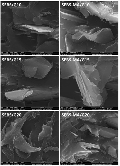 It is worth remarking on the important increase in storage modulus with the increase in G content in SEBS or SEBS-MA composites. The storage modulus of SEBS-MA/G20 was higher by 125% compared to the SEBS-MA matrix and that of SEBS/G20, with 97% vs. the SEBS matrix. This shows both the reinforcing effect of graphite and the compatibilizing effect of MA, which increased the strength at the interface and reduced intermolecular slippage [