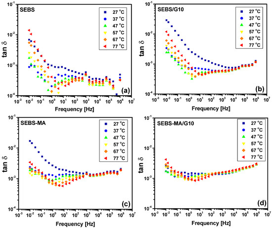 Figure 13 confirm this, showing that the temperature influence on the dielectric loss tangent (tan δ) variation of the SEBS-MA/G10 composite is less important than in the case of the neat polymer or in the case of the SEBS-G10 composite. This improved dielectric stability of tan δ with respect to the temperature variation increases with the G content, as can be seen from the results in