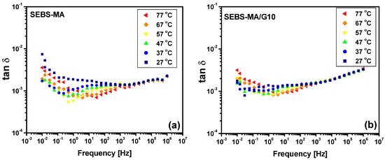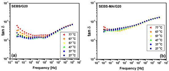 Figure 14. Indeed, the tan δ spectra for the SEBS-MA/G20 composite at all the studied temperatures (