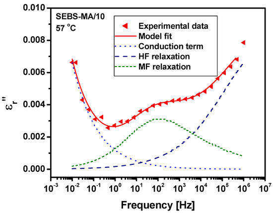 To analyze quantitatively the processes revealed by the dielectric spectra obtained for the SEBS and SEBS/MA composites, one should first identify the dielectric relaxations present in the spectra. As is well known, two dielectric relaxations (labeled α and β) can usually be found in the dielectric spectra of polymers in the frequency range of 10−2–106 Hz above room temperature. The α-relaxation is correlated with the main-chain movement, corresponding to a transition from the glassy state to the rubbery state, as the temperature rises above Tg, whereas the β-relaxation is related to the local motions, such as the rotation of side groups. Furthermore, as the dielectric materials tested in this study are not homogeneous, different interfaces being present either between the PEB and PS blocks in SEBS and SEBS/MA or between the G particles and copolymer matrices, another relaxation can be present in the dielectric spectrum, namely, the interfacial or Maxwell–Wagner–Sillars (MWS) relaxation, due to the charge trapping at these interfaces. Moreover, the free carriers present in copolymers and their composites are responsible for a conduction current that is usually emphasized by the increase in dielectric losses toward lower frequencies.