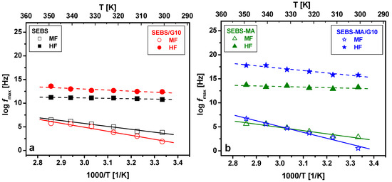 However, even if the presence of MA grafts leads to more flexible S regions, determining the shifting of the HF peak towards higher frequencies, the orientation of the side dipoles requires more energy from the electric field in these materials compared to those without MA. Thus, the activation energy for the β-relaxation is higher in MA-grafted SEBS composites, e.g., 0.42 eV for SEBS-MA/G10 compared with 0.19 eV for SEBS/G10.