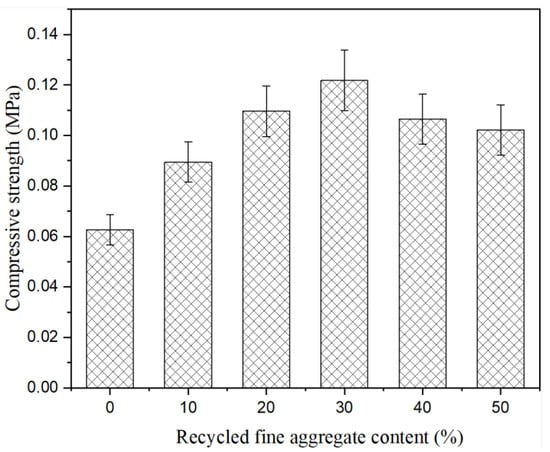 In order to explore the feasibility of recycled fine aggregate as an external material, recycled aggregate was added to soft soil without a composite curing agent, and the influence of recycled fine aggregate content on the compressive strength of soft soil was studied. The results are shown in Figure 2. It can be seen from Figure 2 that recycled fine aggregate content had a significant impact on the compressive strength of soft soil solidified without a composite solidification agent. With the increase in recycled fine aggregate content, the compressive strength of soft soil increased first and then decreased. When the recycled aggregate content was of 0%, 10%, 20%, 30%, 40% and 50%, the compressive strength of the soft soil was 0.06 MPa, 0.09 MPa, 0.11 MPa, 0.12 MPa, 0.11 MPa and 0.10 MPa, respectively. Compared with an absence of recycled fine aggregate, the compressive strength increased by 42.45%, 74.53%, 95.43%, 69.56% and 63.29%, respectively, when recycled fine aggregate content was added at 10%, 20%, 30%, 40% and 50%. When the recycled fine aggregate content was of 30%, the solidification effect on the soft soil was superior. The soft soil was characterized by “three high and two low”, namely, high water content, high porosity, high compressibility, low strength and low permeability. The addition of recycled fine aggregate could provide skeleton support, which was conducive to improving the solidification properties. The above research results show that the technical scheme of adding recycled fine aggregate to improve the solidification effect on soft soil was feasible.