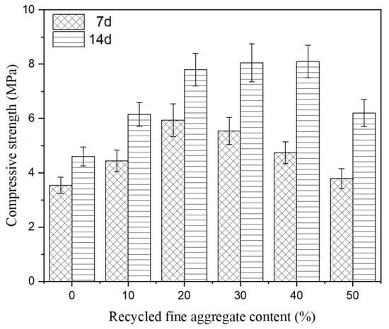 It was feasible to use recycled fine aggregate as an additional material to solidify soft soil, but the solidification effect was not significantly improved by adding recycled aggregate alone, as the compressive strength remained at a low level. The technical scheme of the composite solidification agent cooperating with recycled fine aggregate to improve the solidification properties was designed in the test, and the influence of recycled fine aggregate content on compressive strength was studied. The results are shown in Figure 3. Recycled fine aggregate content had a great impact on the solidification properties of recycled fine aggregate combined with a composite solidification agent. When the solidification age was of 7 days and the recycled fine aggregate content was of 20%, the solidification effect was the best, and the compressive strength increased up to 5.93 MPa. Comparing the addition of recycled fine aggregate and a composite solidification agent separately, the compressive strength increased 48.01 times and 1.32 times, respectively. With the extension of the solidification age, the solidification effect was further improved. When the solidification age was of 14 days, the compressive strength was 8.43 MPa. In conclusion, recycled fine aggregate not only acts as a skeleton to improve the solidification strength, but can also realize the comprehensive utilization of waste.