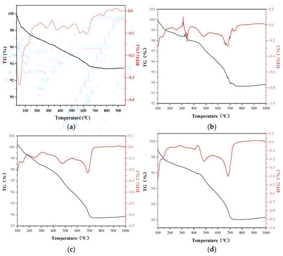 The composition was examined by XRD with Bruker D8-Discover diffractometer(Berlin, Germany) using graphite monochromatized high-intensity Cu Kα radiation (λ = 1.5406 Å). The scanning angle range was from 5° to 90° 2θ with the step at 0.2 s·step−1. TG/DTG analysis was obtained from the STA449 F3 thermogravimetric analyzer (Netzsch, Berlin, Germany). The analyses were carried out simultaneously in a nitrogen atmosphere at a heating rate of 10 °C·min−1 between room temperature and 1000 °C.