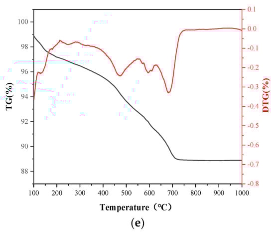 Thermal decomposition of sample under different recycled fine aggregate contents: (a) 10% recycled fine aggregate; (b) 20% recycled fine aggregate; (c) 30% recycled fine aggregate; (d) 40% recycled fine aggregate; (e) 50% recycled fine aggregate.