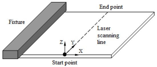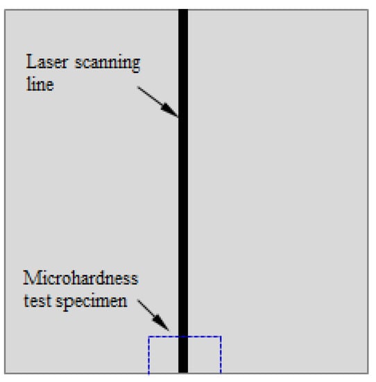 The specimens used in the present experiment were square DP980 high-strength steel plates with dimensions of . The specimens were clamped at one side, and a laser beam scanned them along the center line of the top surface, as shown in Figure 1. A YLR-150/750-QCW-AC laser system manufactured by IPG company in Burbach, Germany was employed for the experiment, with an output power range of 30~280 W and a laser wavelength of 1070 nm. The diameter of the laser spot was 2.5 mm. Nine combinations of laser parameters were selected to investigate their effects on the microstructure and mechanical properties, which are listed in Table 1. Line energy refers to the ratio of the laser energy absorption capacity of the steel plate to the laser-scanning velocity [20], which is calculated by Equation (1).