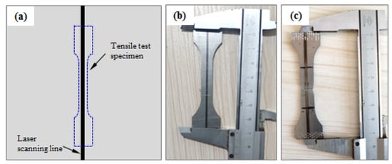 To investigate the effect of laser forming on the strength and plasticity of the specimens, monotonic tensile tests were performed at room temperature on a UTM-5105 universal testing system made by OBT company in Shenzhen, China. The testing items included yield strength, tensile strength, and elongation. The tensile specimens were cut using a DK7740HZ-B wire-cutting machine manufactured by Zhongyuan Machine company in Zhejiang, China, according to the standard of GB/T 228.1-2010: Metallic materials—Tensile testing—Part 1: Method of test at room temperature. Figure 2 shows the cutting position [21] and the photo of the tensile test specimen before and after the tensile test. The gauge length and width of the specimen were 30 and 8 mm, respectively. The extension rate applied in the tensile tests was 2 mm/min. Three repeated tests were performed for each combination of laser parameters. It is clear from Figure 2c that necking appeared, and the specimen failed at about the center of the gauge length.