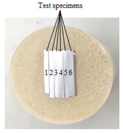 To investigate the microstructural changes of the laser-formed DP980 steel plate, metallographic tests were performed using a 4XC-PC metallographic microscope made by ShangGuang company in Guangzhou, China. Due to their small size, every six specimens were inlaid together for convenience, as shown in Figure 5. After being completely polished, the specimens were etched in the ethanol solution containing nitric acid with a volume fraction of 4% for a few of seconds and then rinsed immediately and dried for microscopic observation.