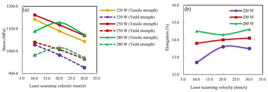 Elongations of the specimens processed under different laser parameter combinations are shown in Figure 6b. At a constant laser-scanning velocity, the elongation increased with an increase in laser power. However, no obvious changes occurred at a constant laser power, which indicated that the elongation of the material was insensitive to changes in laser-scanning velocity. Figure 7b shows the relationship between elongation and line energy, where the elongation of the material was improved slightly under almost all combinations of laser parameters. The largest value of elongation was 14.6%—an improvement of 9.0% compared to the unprocessed steel.
