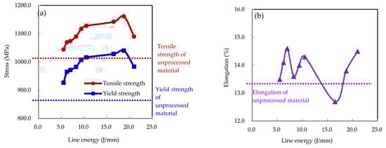 Monotonic tensile properties under different line energies: (a) yield strength and tensile strength; (b) elongation.