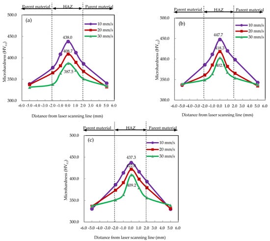 Microhardness distributions of the HAZ and parent material under different laser parameter combinations are shown in Figure 8. According to Figure 8a–c, under a constant laser power, the microhardness of the same position decreased with an increase in laser-scanning velocity. Under the same laser parameter combination, the microhardness of the HAZ was much larger than that of the parent material—reaching a maximum at the laser-scanning line. When using the same laser-scanning velocity, as shown in Figure 8a–c, it was noted that the microhardness increased with an increase in laser power, except for combination 7 (280 W, 10 mm/s), which was consistent with the strength test results reported in Section 3.1. Furthermore, the microhardness difference between the cases of 10 mm/s and 30 mm/s decreased from 50.5 HV0.2 to 28.1 HV0.2 with an increase in laser power, respectively, which indicated that at a lower laser power, microhardness was sensitive to changes in laser-scanning velocity.