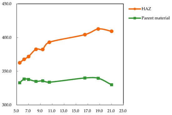 Figure 9 shows the relationships between the average microhardness of the HAZ (as well as the parent material) and line energy. At a constant line energy, the average microhardness of the HAZ was much larger than that of the parent material. The average microhardness of the HAZ increased with an increase in line energy and reached a maximum of 412.8 HV0.2—an improvement of 23.5% compared to the unprocessed material (334.2 HV0.2). In contrast, the average microhardness of the parent material remained almost stable for different line energies and was close that of the unprocessed material.