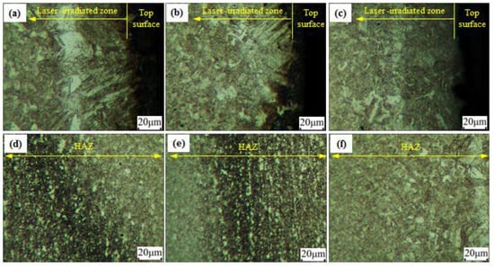 In order to explore the reason for the different strength behavior at 280 W, as shown in Figure 6a, the microstructures of the material formed under the different scanning velocity at 280 W were investigated, as shown in Figure 10. It was confirmed from Figure 10a–c that the grains in the laser-irradiated zone grew significantly at the laser-scanning velocity of 10 mm/s; there was little difference in the other two cases. However, in HAZ, as shown in Figure 10d–f, the grain size at the case of 30 mm/s was the largest. By contrast, the grain size in the case of 20 mm/s was smaller, which led to the higher strength.
