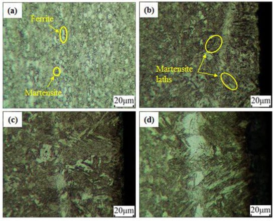 Figure 11 shows the microstructures of the unprocessed material and the laser-irradiated zone of the laser-formed specimen. It was clear from Figure 11a that the microstructure of the unprocessed material consisted mainly of ferrite and martensite. Under a line energy of 8.25 J/mm (Figure 11b), thin and short martensite laths were observed, which enhanced the strength and microhardness of the material. When the line energy was increased to 18.75 J/mm (Figure 11c), it was found that the volume content of the martensite laths increased, which further enhanced the strength and microhardness. However, when the line energy was increased to 21 J/mm (Figure 11d), thick and long martensite laths were clearly observed and the grains grew rapidly due to the lower cooling rate, which is consistent with the research of Liu et al. [23]. The large grain size reduced the strength and microhardness of the material. Therefore, it was concluded that within a range of line energies below around 19 J/mm, the strength and microhardness of the DP980 steel increased with increasing line energy. Furthermore, the elongation of the material was also slightly improved by the laser-forming process.