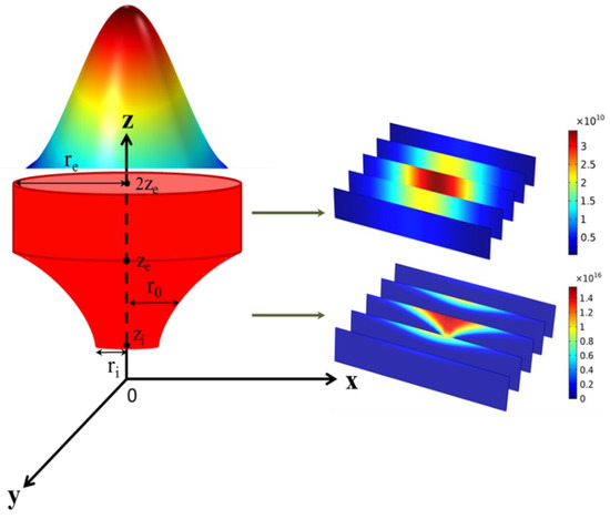 In the traditional simulation of laser–material interaction, a heat source is established to irradiate only on the material surface to be processed because the thickness (several millimeters) of the sample is significantly larger than the laser penetration depth. However, the thickness of the powder layer during the L-PBF process is normally less than 100 μm, but the laser penetration depth is normally larger than that. Due to the larger thickness of the laser penetration depth, an appropriate heat source should be established for the simulation of the L-PBF process. Furthermore, laser scattering occurs while irradiating on the surface of the powder bed, which causes the difference in laser energy distribution between the surface of and inside the powder bed. Therefore, an innovatively combined volumetric heat source rotating model to distinguish the difference in laser–powder interaction between the surface of and inside the powder bed is proposed. The heat source model and the interaction positions of the two heat sources in the combined model are schematically shown in Figure 1, consisting of a parabolic rotating distribution volume and a cylindrical distribution Gaussian heat source model. Its upper part reveals the laser–powder interaction on the surface of the powder bed, which can be described as follows [26]: