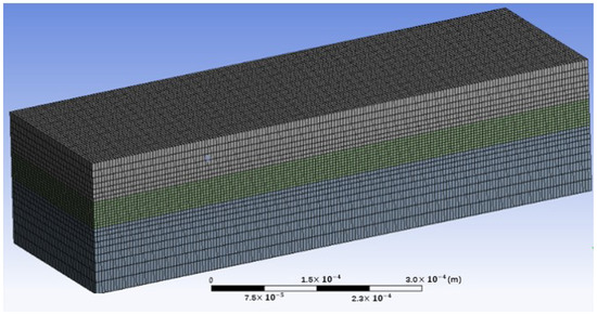 Accuracy in numerical simulation is very important and primarily depends on the element and meshing with the appropriate models of the powder bed and the heat source. Figure 3 exhibits the meshing results, where hexahedral meshes are utilized for fine powder and coarse meshes for substrate due to the importance of the powder melt and resulting melt pool. The number of meshes and notes is 232,544 and 247,563, respectively, which is a balance between time, cost, and computing accuracy. To better understand the simulation model and the analysis of the melt pool characteristics, Figure 4 shows some important information, including the coordinate system of the model, the relative position of the powder layer with a thickness of 40 μm to the substrate, the laser scanning direction, the first and second melt tracks and their different sections, and the melt pool geometry (depth and width). The simulations in this paper were run on a desktop computer (2.5 GHz CPU and 16 GB RAM).