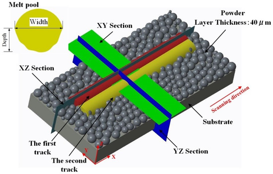 Simulation analysis model including powder layer, substrate, melt tracks and their laser scanning direction, different cross-sections, and melt pool geometries (depth and width).