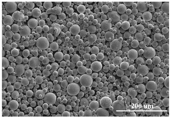 Gas-atomized Ti6Al4V powder material, of which the average particle size is 38 μm, was provided by EOS (EOS GmbH, Electro Optical Systems). Table 2 lists its nominal chemical composition. In addition, Figure 6 and Figure 7 reveal the size distribution of powder particles from 15 to 83 μm and their spherical morphologies in SEM, respectively. In order to avoid the possible formation of pores and the effect on the fluidity of the powder due to wet powder during the L-PBF process, the powder material should be dried under vacuum prior to the experiment.