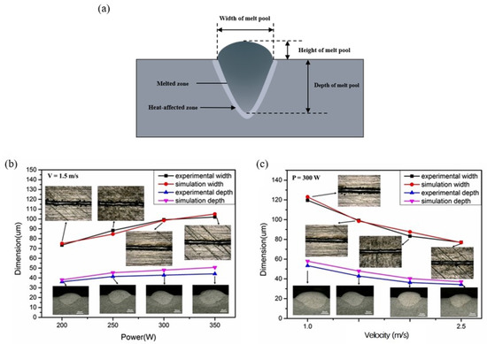 Schematic diagram of melt pool and its dimension (a); morphology and shape of the melt pool in experiment and simulation with different laser power (b); scanning velocity (c).