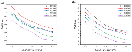 Geometry change of the melt pool characterized by the depth (a) and width (b) with different laser power and scanning velocity.