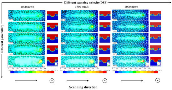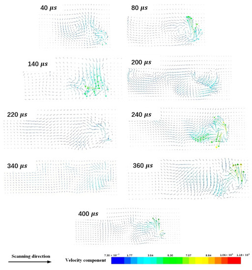 When the laser irradiates on the powder bed with a higher laser power of 400 W and a relatively slower velocity of 1000 mm/s, the temperature of the fluid in the melt pool is at a relatively higher level. Its flow direction is not obvious, as can be seen in Figure 11c. However, according to Gunenthiram et al. [21], higher fluid velocity and the more violent evaporation associated with a higher heat input will lead to another possible problem such as spatter.