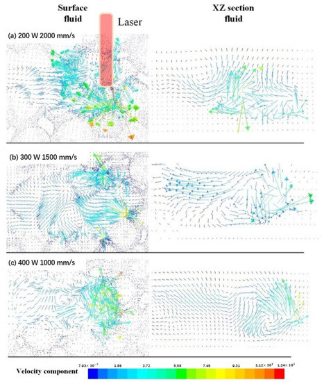 Based on the fluid-dynamic mechanism in mesoscale, the depth and width dependent on its temperature distribution are the results of the fluid flow in the melt pool, which is collectively determined by process parameters such as laser power, scanning velocity, and so on. Figure 11 shows the fluid flow in the melt pool at the laser scanning time of 200 μs with three sets of process parameters.